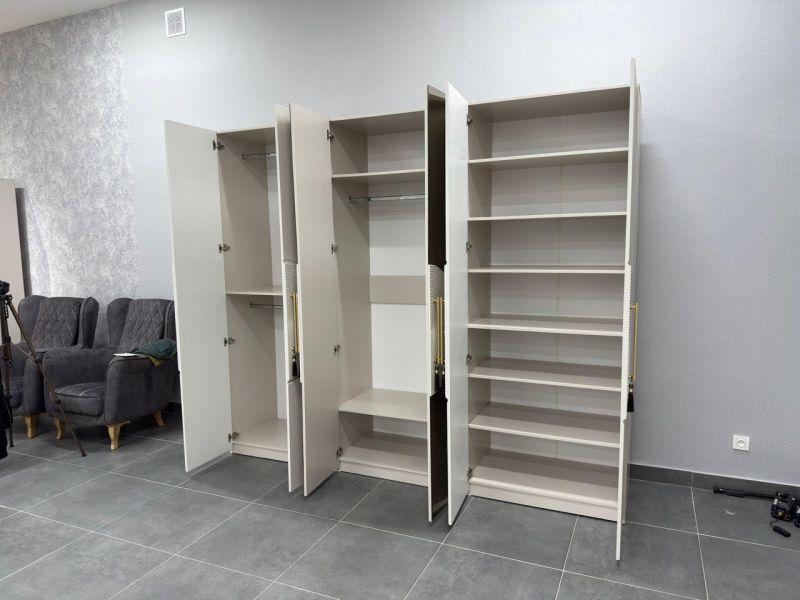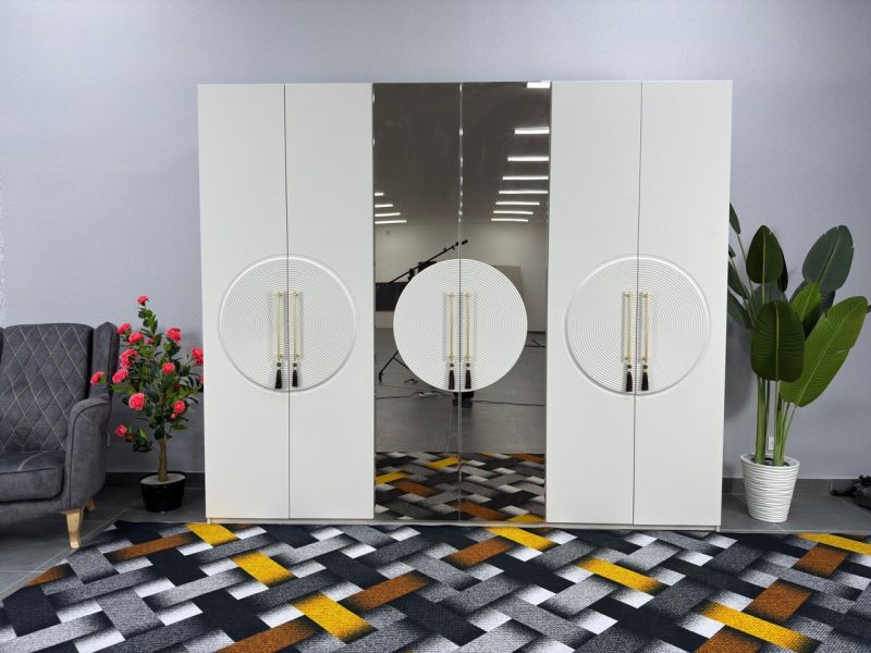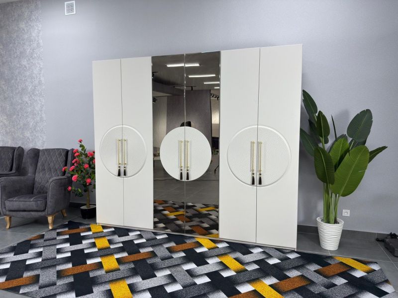 Лаконичные формы, гармония симметрии и эффектный акцент — круглый рельефный декор с золотыми ручками придаёт шкафу особый характер.
